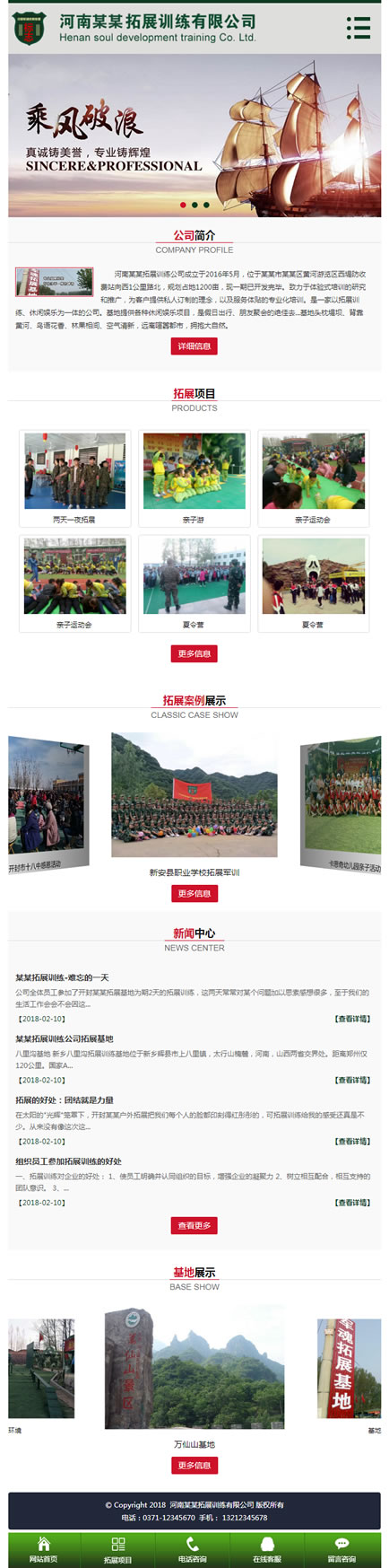 模板程序独家销售,纯手工制作网站代码本网站源码以绿色为主,搭配红色,通用企业源码,适合拓展培训、企业管理、企业培训,户外培训,野外拓展培训等相关培训企业机构网站制作。